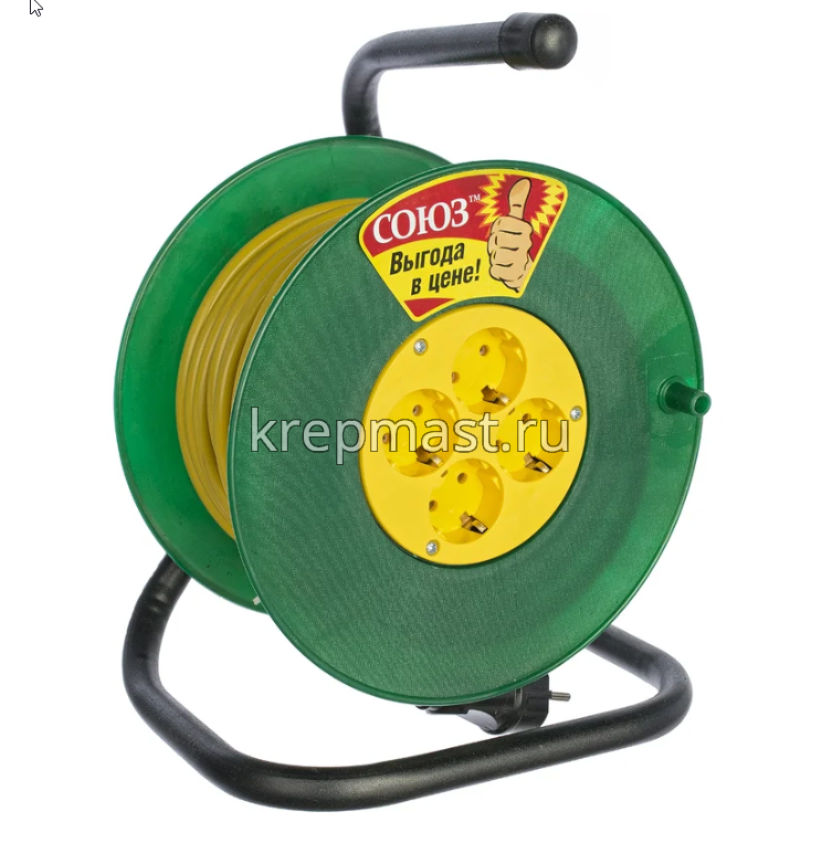 Удлинитель на катушке УСИЛЕННЫЙ Союз 4 х20м ПВС 3х2,5 c/з прочное и надежное изделие для работы на удалении от стационарной розетки. Удлинитель имеет заземляющий контакт. Четырехместная розетка позволит подключить сразу несколько электроприборов. Высокая износостойкость и долговечность обеспечиваются за счет ударопрочного пластика катушки и стальной подставки с порошковым покрытием от коррозии.