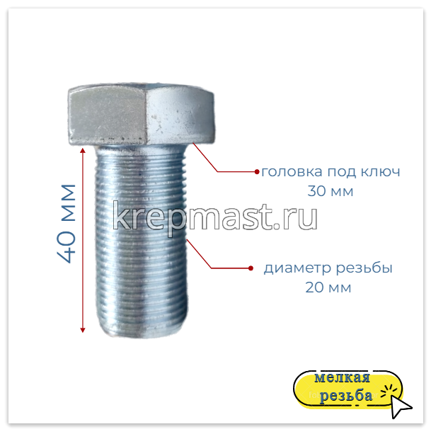 Болт DIN 961 20х 40х1,5 кл.пр. 10,9 ОЦИНК. п/р с мелкой резьбой в интернет-магазине «Мастер Крепежа» по цене 390 руб. Более 6 наименований товаров в наличии в категории Болты 20мм с мелкой резьбой. Купить болт din 961 20х 40х1,5 кл.пр. 10,9 оцинк. п/р с мелкой резьбой в Нижнекамске выгодно Вы можете on-line на нашем сайте, или отправив заявку по почте, а также по телефону или в пункте выдачи компании г. Казань, ул. Татарстан, 9, магазин "Мастер Крепежа". Доставка по Республике Татарстан и другие регионы РФ.