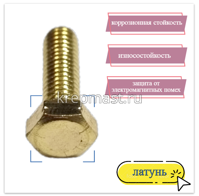 Болт М5 х 16 DIN 933 используется в случае, когда необходимо создать немагнитный узел. Латунный болт М5 применяется в приборостроении, авиации, атомной промышленности. Латунный крепеж стоек к органическим кислотам и углекислым растворам.