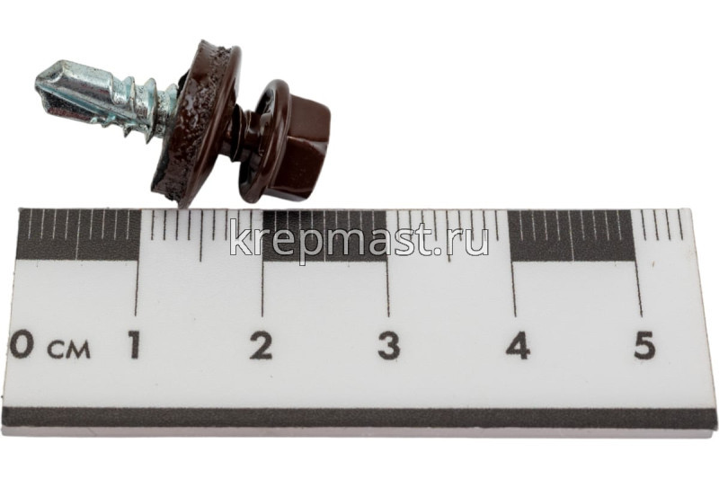 Кровельный саморез окрашенный с шайбой и резиновой прокладкой EPDM DIN 7504 5,5 х 19 по металлу RAL 8017 (цвет шоколадный) - представляет из себя саморез с шестигранной головкой, фланцем и резиновой прокладкой для эффективного прижатия листового металла к основанию.