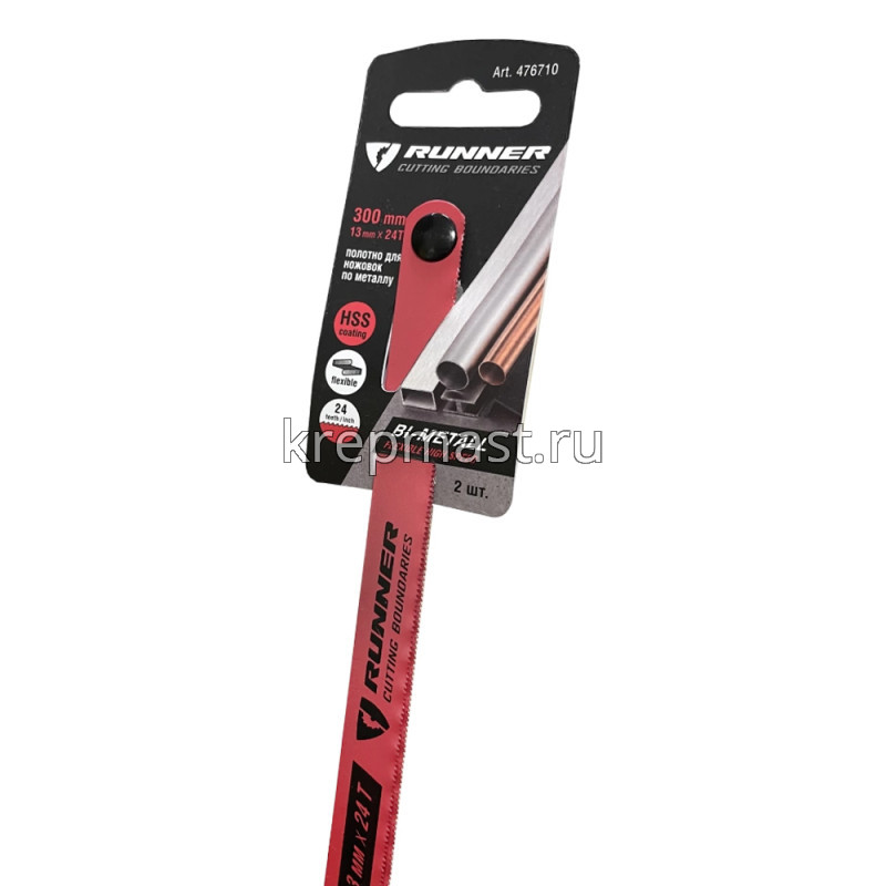 Полотна для ножовки по металлу Runner 300 мм. (2 шт) (красные) изготовлены из гибкой углеродистой стали, имеют гибкие переменные зубья в наваренной полоске из высоколегтрованной быстрорежущей стали. Полотно ножовочное по металлу оснащено режущей кромкой с количеством зубьев 24 tpi.