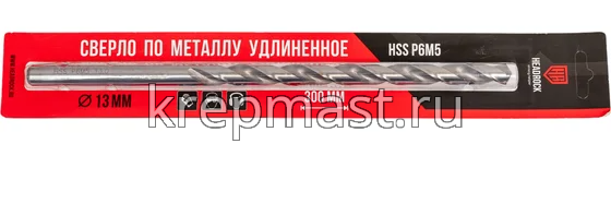 Удлиненное сверло по металлу М 13,0 x 300 мм изготовлено из быстрорежущей стали Р6М5. Сверло шлифованное и имеет цилиндрический хвостовик. Подходит для сверления цветных металлов. Угол заточки при вершине — 135 градусов, а класс точности — А1.