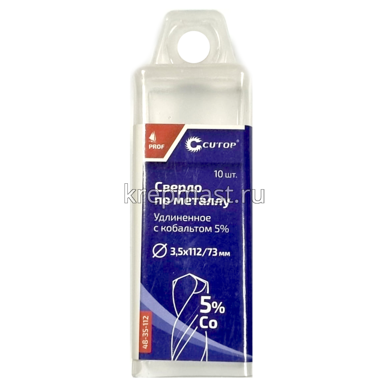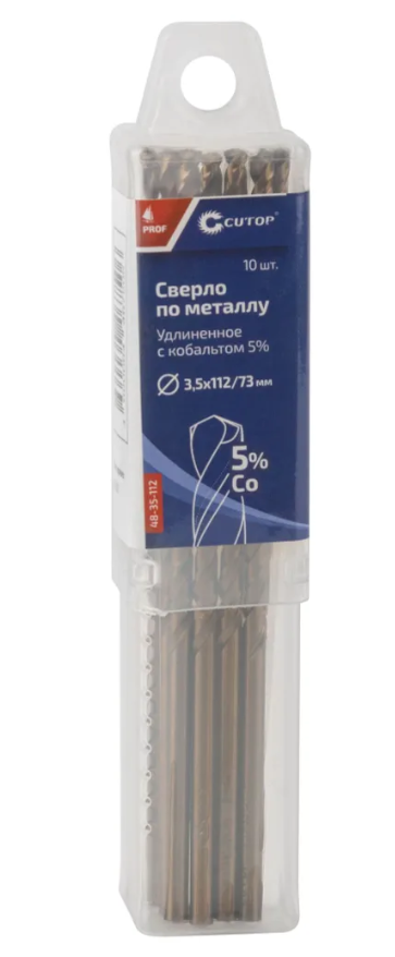 Удлиненное кобальтовое сверло по металлу М 3,5 x 112мм CUTOP изготовлено из быстрорежущей стали Р6Co5М5. Сверло шлифованное и имеет цилиндрический хвостовик. Подходит для сверления цветных металлов. Угол заточки при вершине — 135 градусов, а класс точности — А1.