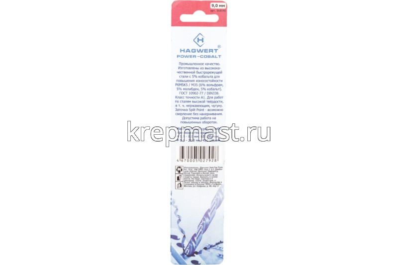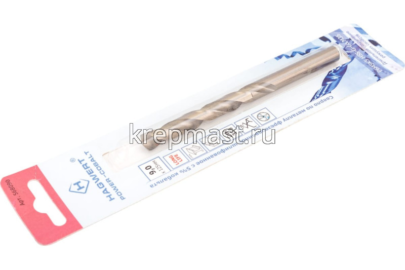 Кобальтовое сверло по металлу М9.0 x125мм Hagwert изготовлено из быстрорежущей стали HSS с 5% добавкой кобальта, что обуславливает высокую прочность и долгий срок службы оснастки. Сверло шлифованное и имеет цилиндрический хвостовик. Подходит для сверления труднообрабатываемых и нержавеющих сталей, цветных металлов. Угол заточки при вершине — 135 градусов, а класс точности — А1.