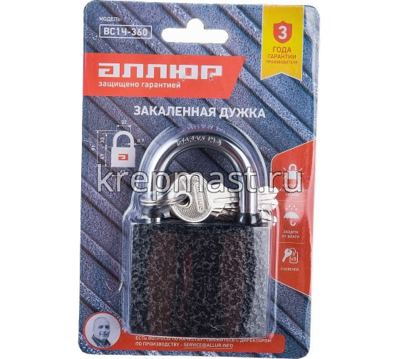 Навесной замок Аллюр ВС1Ч-360 используют в качестве дверного висячего замка для нежилых подсобных помещений, кладовки, сарая или бани. Закаленная полукруглая дужка из стали обладает высокой устойчивостью ко взлому и распиливанию.