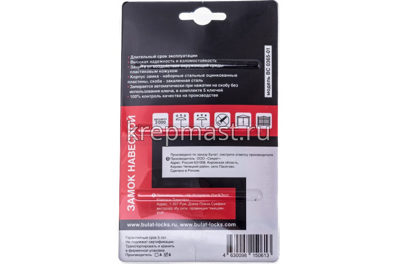 Замок навесной БУЛАТ ВС 0365-01 водостойкий в интернет-магазине «Мастер Крепежа» по цене 1283 руб. Более 10 наименований товаров в наличии в категории Замок водостойкий. Купить замок навесной булат вс 0365-01 водостойкий в Нижнекамске выгодно Вы можете on-line на нашем сайте, или отправив заявку по почте, а также по телефону или в пункте выдачи компании г. Казань, ул. Татарстан, 9, магазин "Мастер Крепежа". Доставка по Республике Татарстан и другие регионы РФ.
