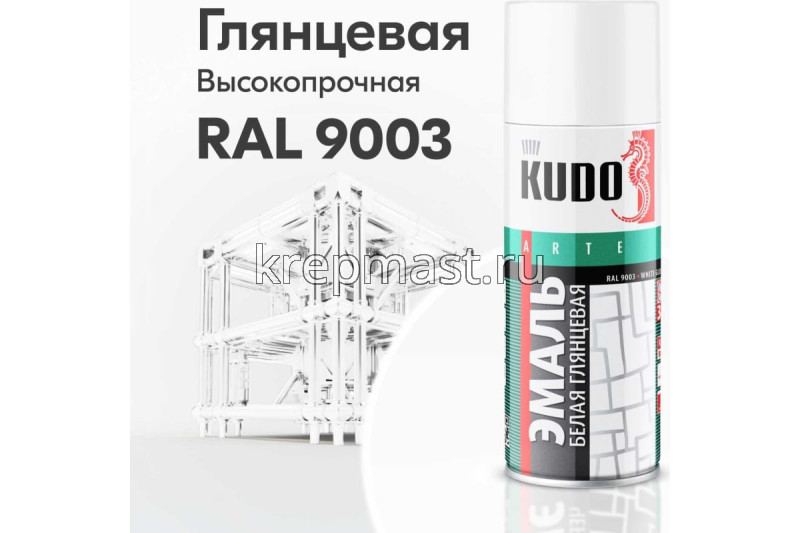Краска KUDO белая глянец RAL 9003 - высокопрочная универсальная глянцевая аэрозольная эмаль в баллончике, предназначенная для окраски предварительно загрунтованных металлических и деревянных поверхностей. Аэрозольная краска легко наносится на труднодоступные места. Образует долговечное покрытие с хорошей укрывистостью, атмосферостойкостью, превосходной адгезией к окрашиваемой поверхности. Применяется для наружных и внутренних работ.