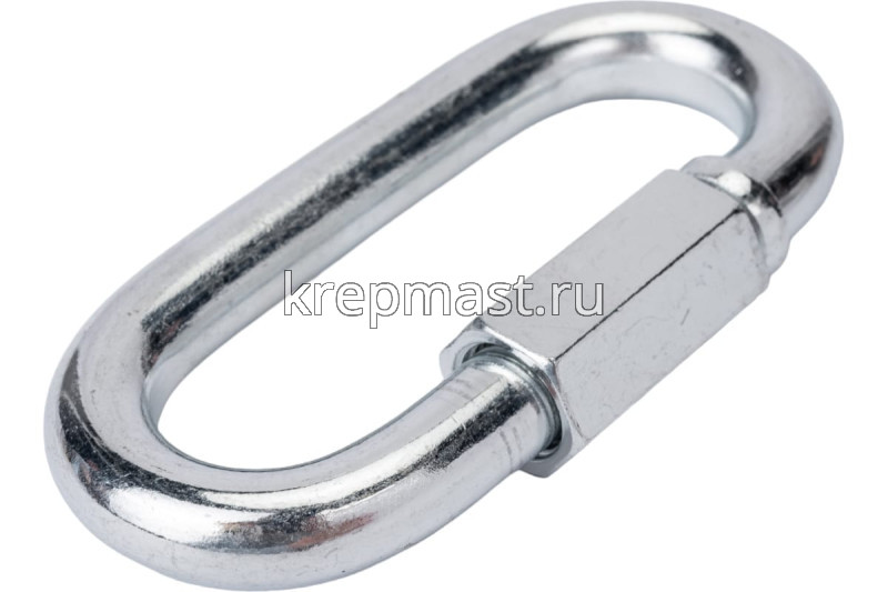 Соединитель цепей с гайкой 12 х 81,0 (карабин винтовой) - cтальной карабин "звено цепи" с винтовой муфтой (фиксатором) применяется для быстрого и надежного крепления тросов и цепей между собой или к чему-либо. Размер карабина определяется по диаметру поперечного сечения проволоки (прутка) и составляет 12 мм.