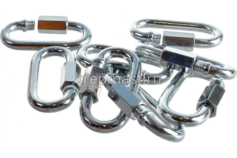 Соединитель цепей с гайкой 8 х 58,0 (карабин винтовой) - cтальной карабин "звено цепи" с винтовой муфтой (фиксатором) применяется для быстрого и надежного крепления тросов и цепей между собой или к чему-либо. Размер карабина определяется по диаметру поперечного сечения проволоки (прутка) и составляет 8 мм.